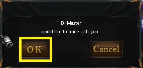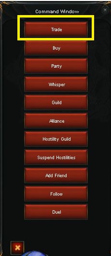 Presiona la tecla "D" para abrir el Command Window y selecciona el botón Trade (recuadro amarillo) teniendo el cursor sobre el otro jugador.